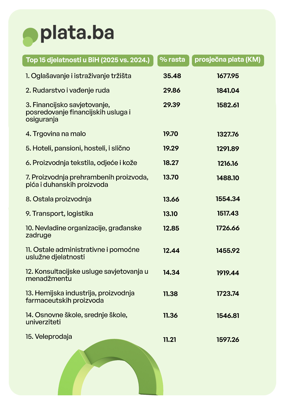 Analiza petnaest djelatnosti s najvećim rastom prosječnih neto plata pokazuje šaroliku sliku tržišta rada. Najviša povećanja zabilježena su u oglašavanju i istraživanju tržišta, rudarstvu i vađenju ruda, finansijskom savjetovanju i posredovanju finansijskih usluga.